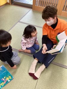 お友だちが読んでもらっているのを見て、そぉっと隣に座って一緒に楽しむ姿も多く見られます。そんな時は、小脇に自分のお気に入りの絵本を抱え読み終わると同時に「次、これ読んで〜