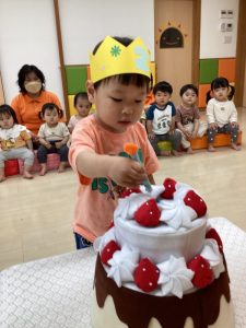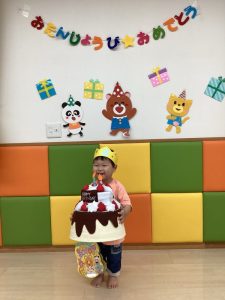 4月は「みんなで仲良く遊ぼうね」と歓迎会をしましたが、今月はいちご組のお友だちがいちばん乗りでお誕生日を迎えみんなでお祝いする事が出来ました![]()