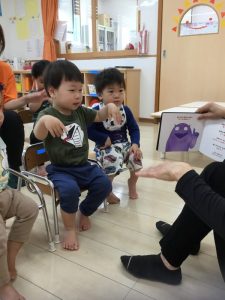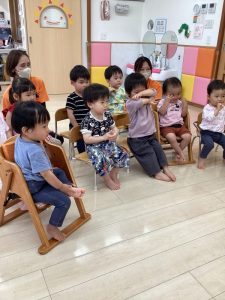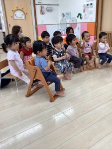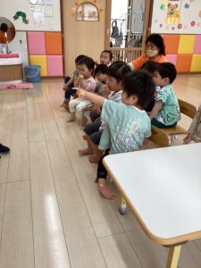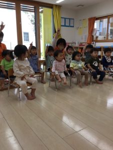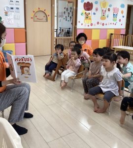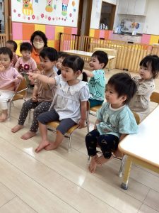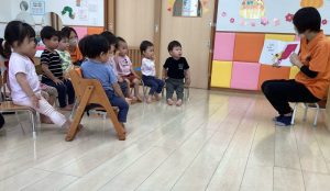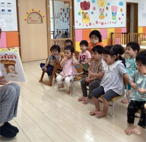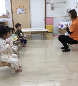 「今日は新しい絵本を読んでみようかなぁ〜」と言う先生の声に「ヤッタァ〜」と大張り切りです