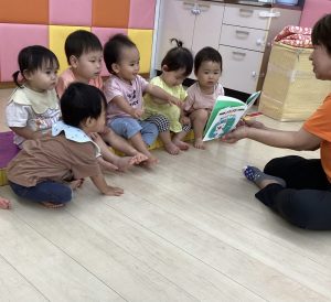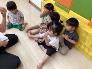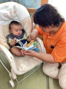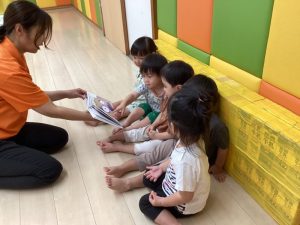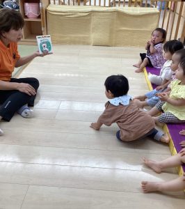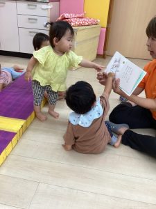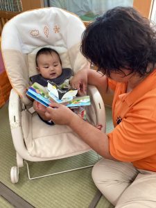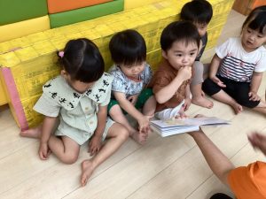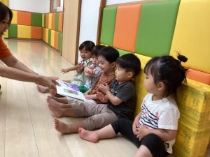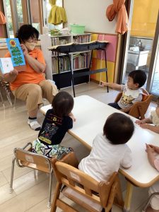 しっかり外遊びを楽しんだ後は心も体ものんびり休憩です。そんな休憩タイムにクラスで絵本の読み合いをしています