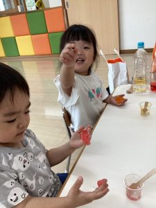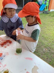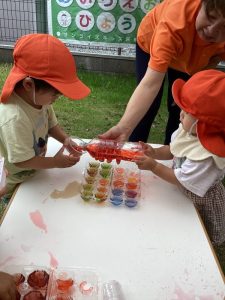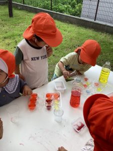 「赤と青の色水を混ぜると・・・」「あっ、紫になったぁ〜」とビックリしたり喜んだり…