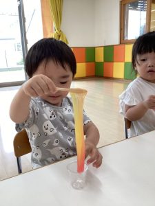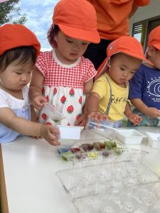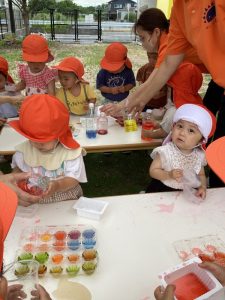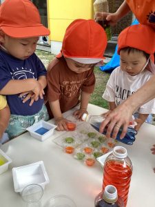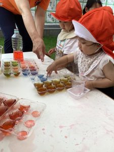 曇り空の日には、1歳児と2歳児合同での色水遊び