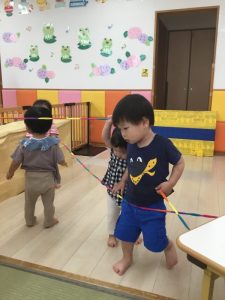 カラフルなゴムの蜘蛛の巣くぐりやシャボン玉、スライムは各クラスでじっくり楽しんでいた活動です