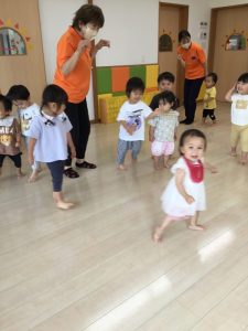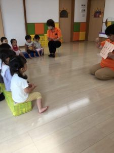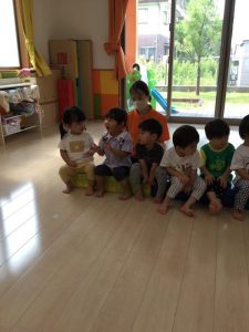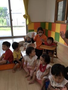 「〇〇ちゃん」とお名前を呼ばれたお友だちは、先生と同じテンポや高さで「はぁい🙋🏻♀️」と応えます。
