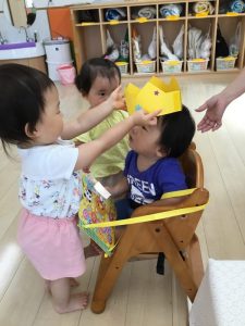 今月が誕生日のお友だちはとてもシャイで、途中涙が出る場面もありましたが、誕生日会が終わるとホッとしたのかカードを眺めたり冠を被り直したりとみんなにお祝いして貰った事が嬉しかった様子を垣間見る事が出来ました