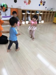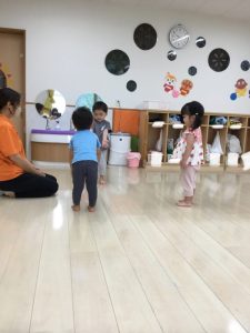 お友だちの方を向いて「ぽん」もらう方もお友だちを向いて「キャッチ」