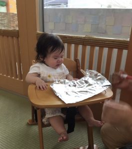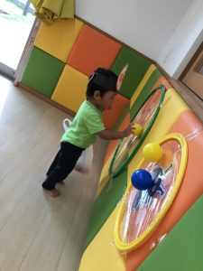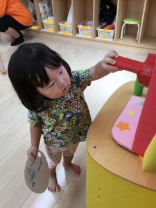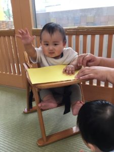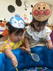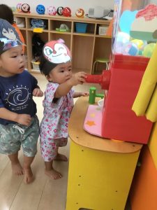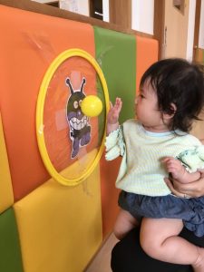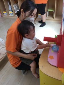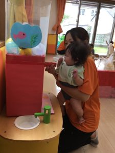 まだ歩く事が出来ないもも組のお友だちは、先生に抱っこしてもらって色々なゲームを楽しみました。また、大きいクラスのお友だちはクラスのお友だちと一緒にそれぞれのコーナーを回りながら会話も弾んでいました