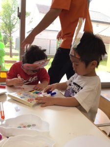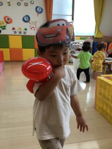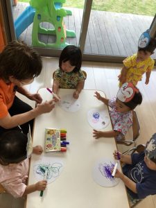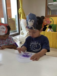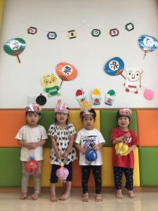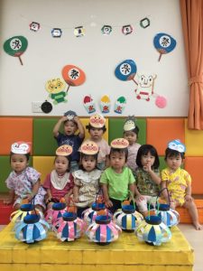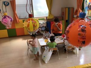 子どもたちには少し早めに「納涼祭をするよぉ〜」と話しをして納涼祭が待ち遠しくなるように、お面や提灯を作って準備をして来ました。その甲斐あって納涼祭当日は、大盛り上がりでした