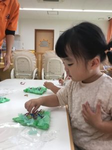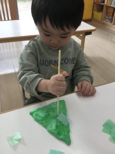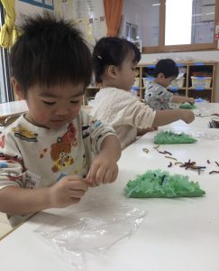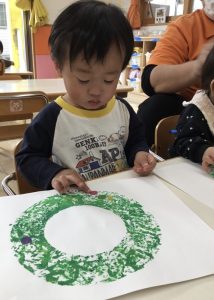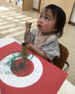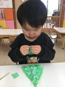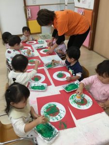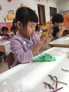 お天気が悪くて戸外遊びができない時は、保育室内で行事の製作を楽しんだり、身体をたくさん使った運動遊びを楽しんだりしている子どもたちです![]()