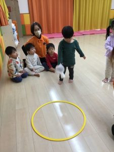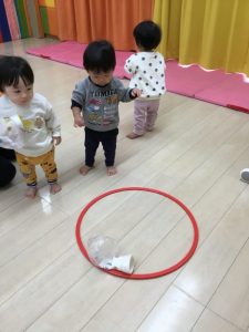 紙コップ風船をフープの中に投げて入れます。