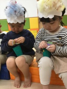緑色の紙コップにキラキラシールを貼っていますよ![]()