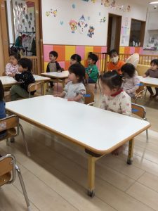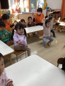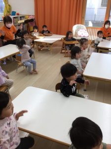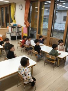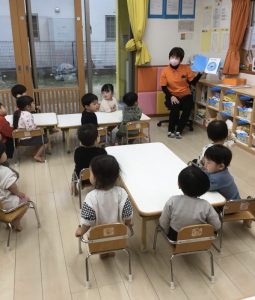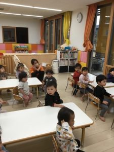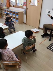 子どもたちみんなで1冊の月刊絵本を読み合うと「見えないなぁ〜🤔」と感じて自分で見える位置まで椅子を動かしたり先生に動かして貰ったりします。また、大きい組のお友だちが笑うと「何で笑ったの