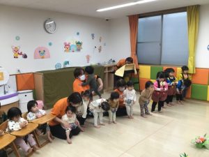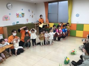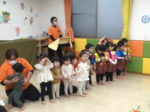1月20日に親子イベント(発表会)を開催しました。本来ならば12月11、12日の2日間で開催されるはずだったのですが、インフルエンザパワーに負けてしまい、やむ無く見送りとなってしまいました。中止にするか延期にするかの葛藤もありましたが「毎日、少しずつ練習をしていた出し物を是非、保護者の皆様に観て欲しい。」という先生たちの強い思いから当初とは少し開催方法が違うけれど披露する機会を設ける事になりました。