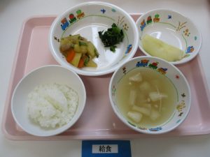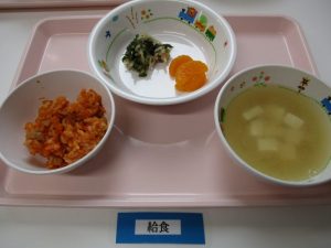 <幼児食> *わかめごはん *たつたあげ *ごま和え *さつまいもの味噌汁 *パイン缶 ...