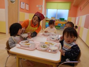 こうやってみんなでたべるととってもおいしいよ!