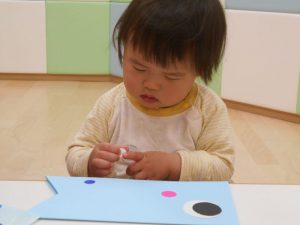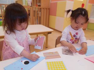シール貼りやお絵かきをして楽しそうに作っています