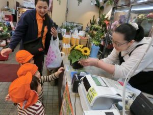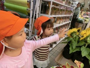 お花屋さんでは、お店に並んだたくさんの花があって、せんせいから