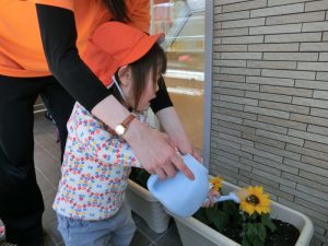 そして こちらは咲いているいるひまわりさんにお水やり中です。