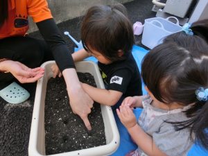 一粒ずつ、先生が穴をあけてくれた場所に入れたよ!
