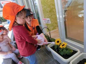 そして こちらは咲いているいるひまわりさんにお水やり中です。