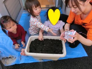 1歳児さんはお買い物に行ってないのですが、一緒に植えてみたよ。、