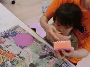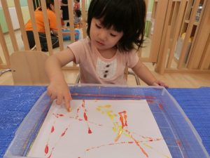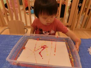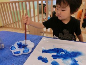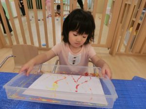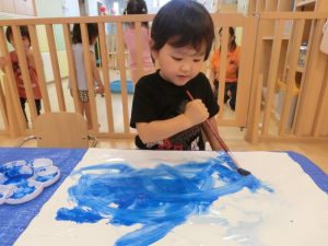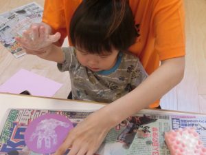 絵具のちょっと冷たい感覚と、色紙に自分の手が映る手形スタンプに