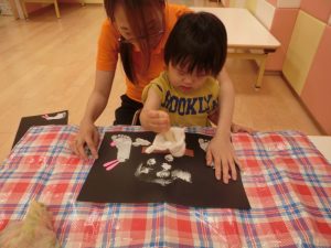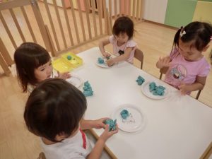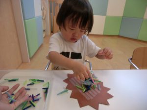 保育者と一緒にハサミの使い方を練習したり、使う時のルールを学んだりしています。