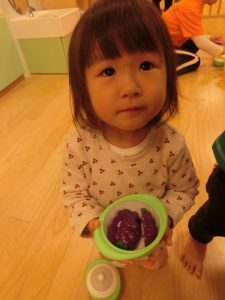 とブドウのおもちゃを持ってきて、お料理してくれました![]()
