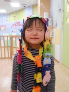 なんと、フェルトの魚つなぎを見立てて髪の毛に![]()