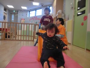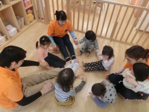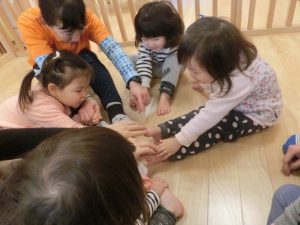 次は、手を繋いでみんなで足を合わせお花の形なって座ろう!