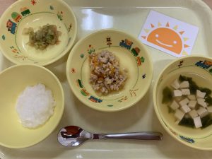 ※スプーンを使う子、手づかみの子、個々の成長にあった食べ方をしています。おいしく楽しく食べるということを繰り返すことで、給食が楽しみになってくれたら良いと思っております。