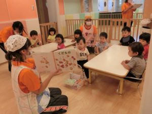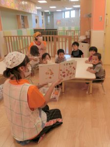 サンライズキッズ保育園では、日々子どもたちが絵本に親しみ、そこから言葉の発達を促せられるように10冊の絵本の読み聞かせを行っています。