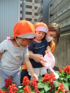 晴れ間を見つけては、少しその空気を吸いに身近な距離を散歩したり、園で育てている花やトマトに水やりもしています![]()