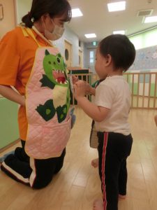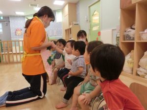 子どもたちへの促しや言葉がけのタイミングも重要になってきます。保育者もそれを見逃さず、子どもたちの成長を見守って保育を進めています。