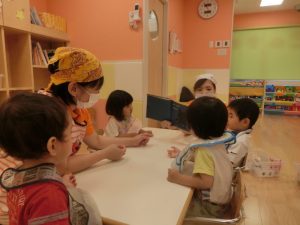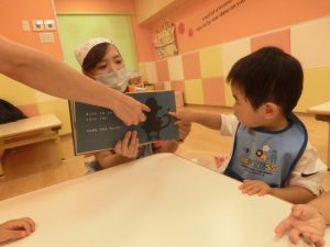 いつも通り、日本語でのお話が始まるかと思っていた子どもたち。不思議そうな表情をしながらも耳を傾けて絵本を見ていました![]()