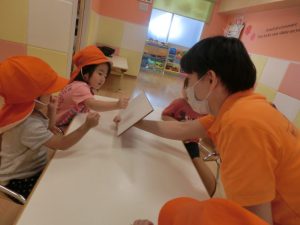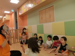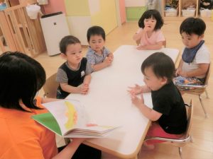 絵本への興味関心を深められるように、違った保育士が読み聞かせを行うことによって色々な声や読み方を体験することができ、その中で飽きが来ず楽しみながら集中力が養われていきます![]()