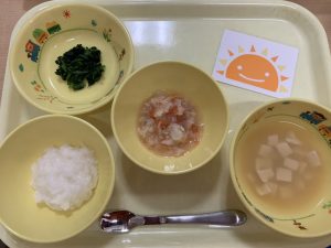粥 味噌汁 白身魚と野菜のくず煮 ほうれん草のお浸し