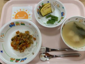 ご飯 夏野菜のそぼろ丼 いんげんの塩ゆで バナナ