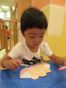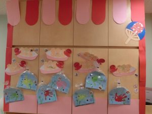 瀬田駅前園では、子どもたちに季節を感じてもらえるように保育室の壁面をお祭りの屋台にしたり、子どもたちと一緒に制作を行って、少しずつへ壁面を増やしています![]()