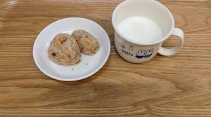 ※おやつのおにぎりは、小さな三角形と俵型に作りました。簡単なおにぎりも形をアレンジするだけで楽しんで食べれるかと思います♪