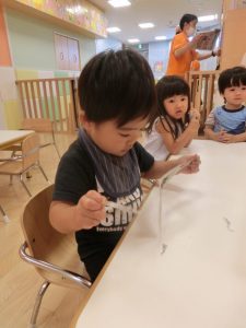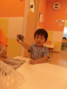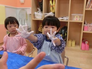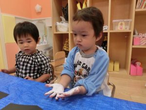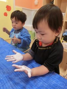 絵具の感触が気持ちよく手をじっと見つめる姿も見られました![]()