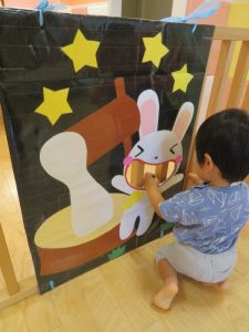 みんなで作ったお団子ウサギさんのお口の中に入れ