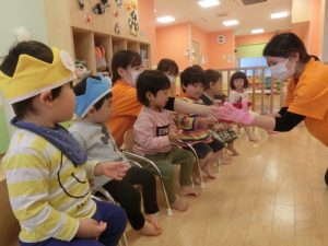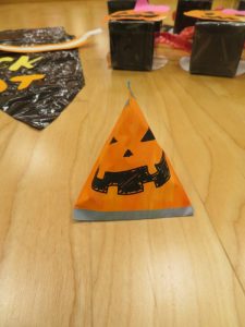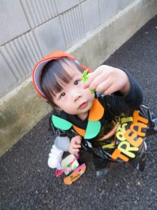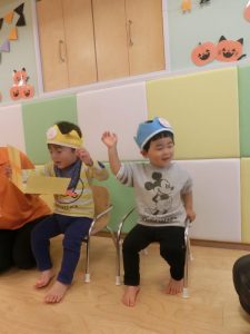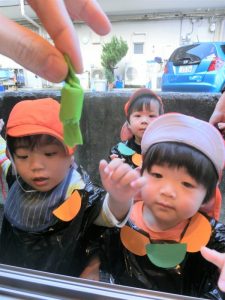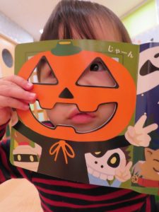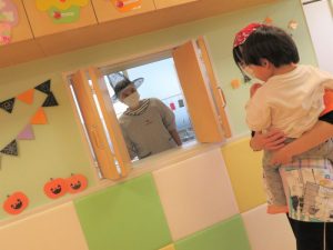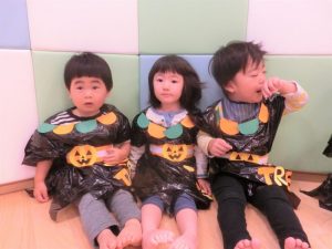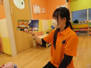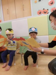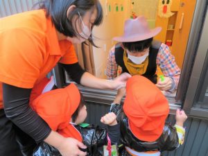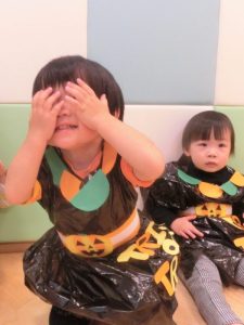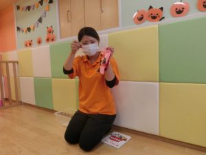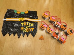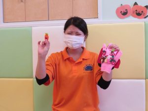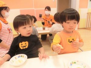 おやつと一緒にかぼちゃの飾りをもらう事が出来、子どもたちも少しづつハロウィンの世界へ...