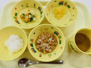 粥 鶏ひき肉と野菜の煮物 コロコロサラダ オレンジ
