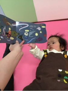 近頃0歳児クラスのお友達は絵本に興味を持って来ています。