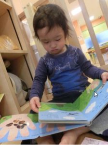 自由遊びで絵本をペラペラとめくって見ているところです