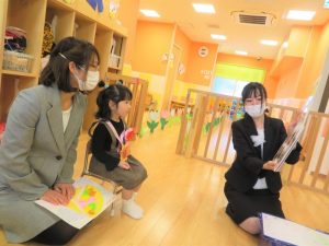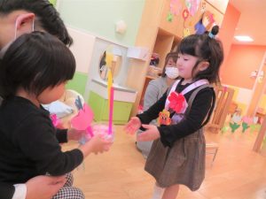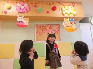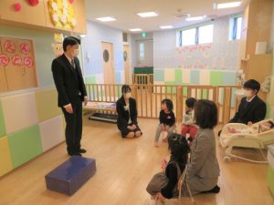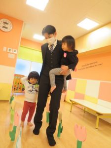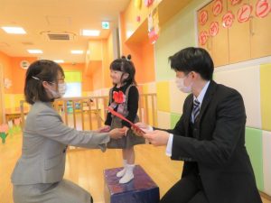 りんご組さんの卒園式に参加するいちご組さん2名と