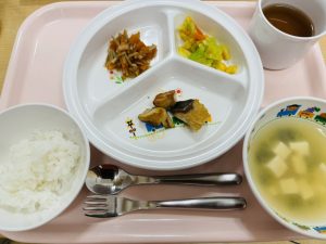 粥 味噌汁 魚と野菜のだし煮 にんじんの甘煮 キャベツのやわらか煮