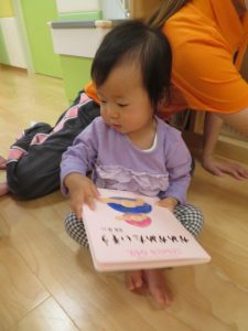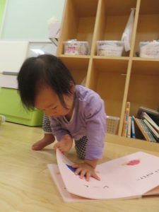 今回は、室内遊びをしている時に、「絵本を見る
