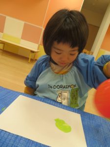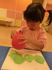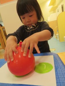 こちらは、いつも遊んでいる風船に絵具をつけて